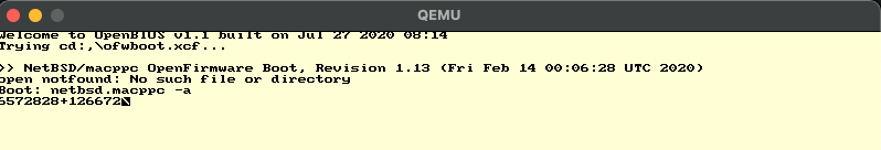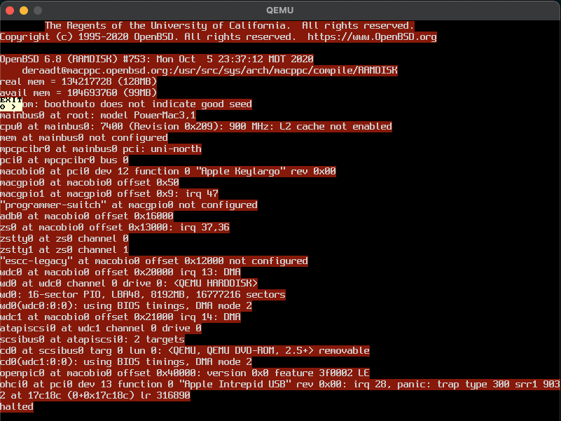 Unfortunately I have been unable to get OpenBSD/macppc to boot properly. Version 6.8 panics straightaway on default ppc emulator setup. Using -machine mac99 gets further but hangs during the probe of adb0. Using via=pmu gets further but panics with the USB bus is probed. Using via=pmu-adb gets further again but panics for 6.8 on the USB bus probe and hangs on earlier versions. I've tried 6.4, 6.6 and 6.7. No joy. I'm sure this could be fixed.
