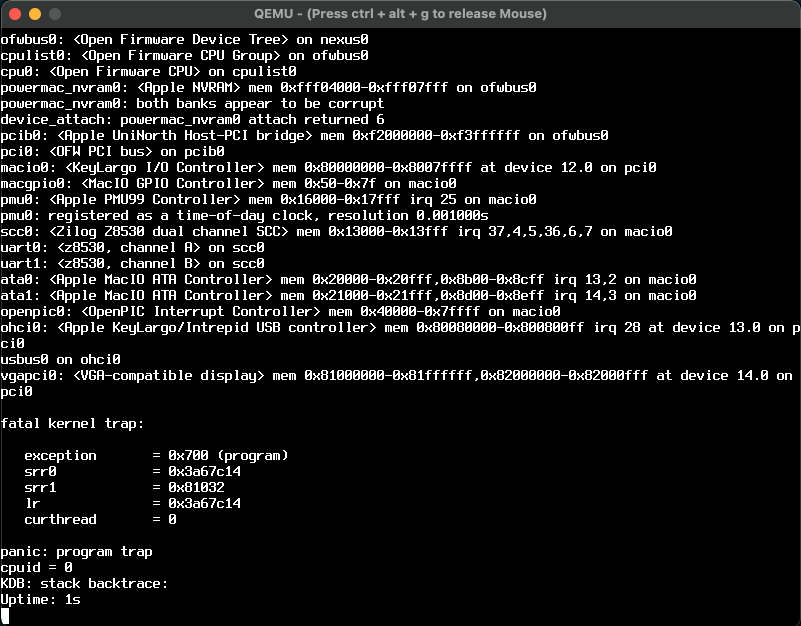 More stories from the failure department I'm afraid. FreeBSD will not boot on the PowerPC emulator. The vgapci driver does not like the underlying hardware. Again, I'm sure this could be fixed with a quirk added to the FreeBSD kernel, or a quirk added to Qemu somewhere. I've tried FreeBSD 11.4 and 12.2.